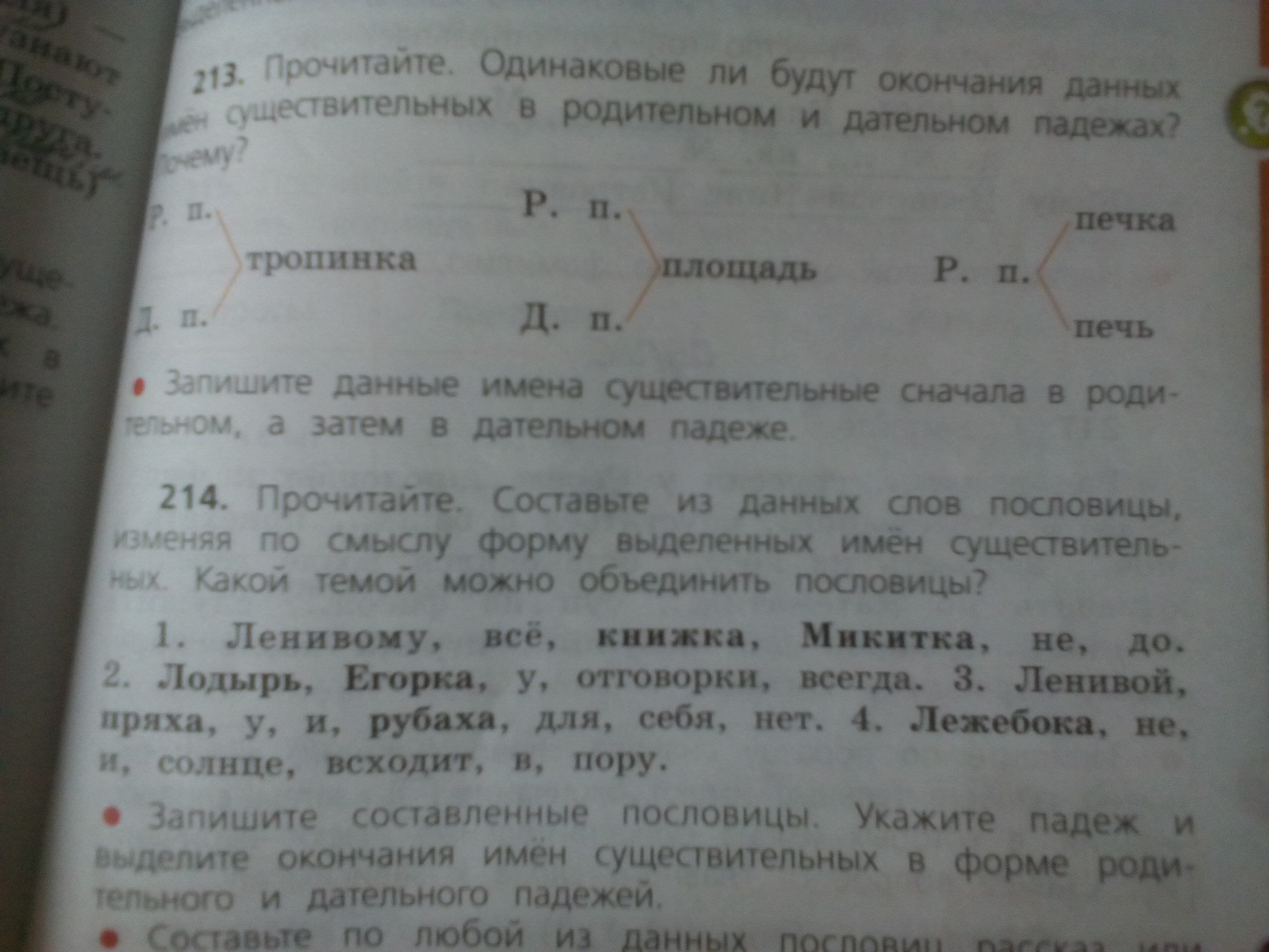 Митике (д.п),книжки (р.п),лодыря (р.п),Егорки(р.п),отговорки(р.п),пряхи (р.п),рубахи (р.п),лежебоке (д.п).