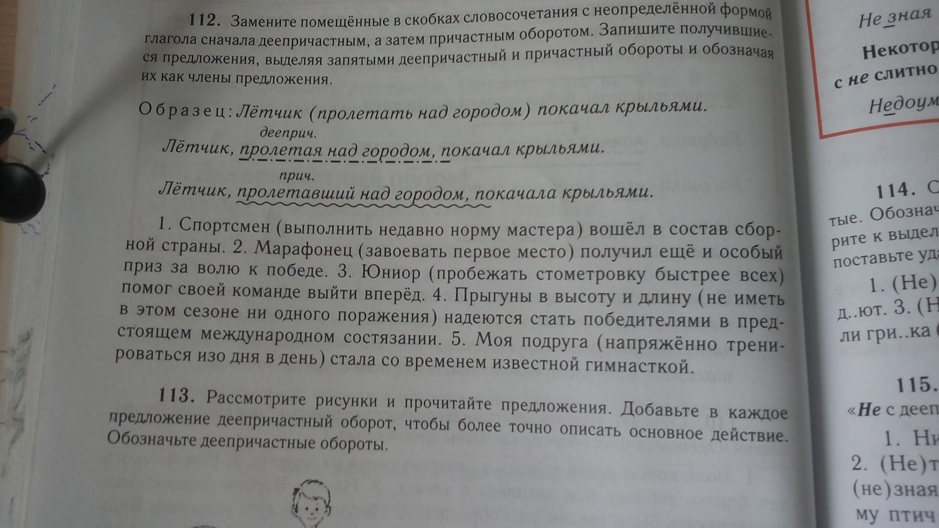 1)Спортсмен,выполняя недавно норму мастера, вошел в состав сборной страны. Спортсмен,выполнивший недавно норму мастера, вошел в состав сборной страны 2)Марафонец ,завоевавший первое место, получил особый приз за волю к победе. Марафонец,завоёвывая первое место, получил особый приз за волю к победе 3)Юниор, пробежавший стометровку быстрее всех, помог своей команде выйти вперед. Юниор, пробегая стометровку быстрее всех, помог своей команде выйти вперед.4)Прыгуны в высоту и длину ,не имевшие в этом сезоне не одного поражения, надеются стать победителями предстоящем международным состязанием. Прыгуны в высоту и длину ,не имея в этом сезоне не одного поражения, надеются стать победителями предстоящем международным состязанием.