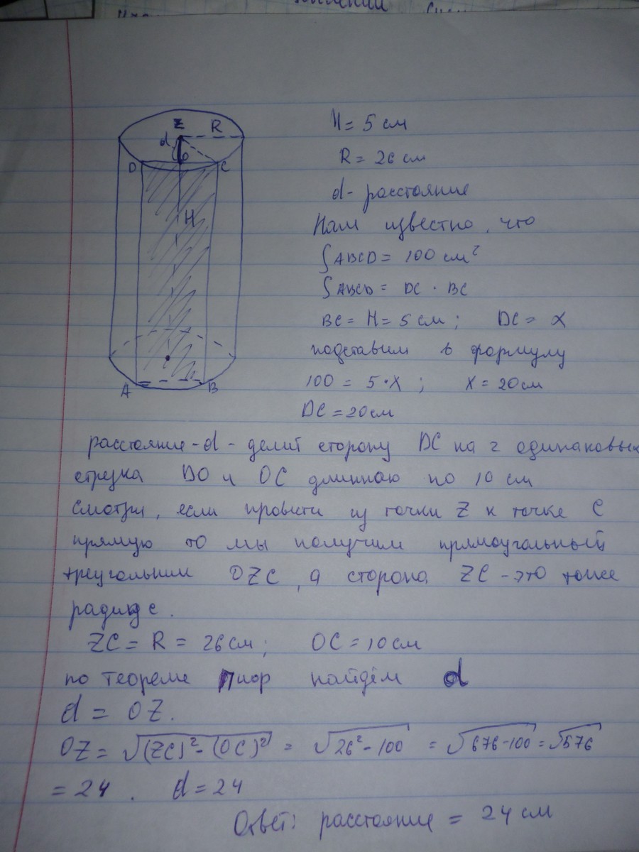 высота цилиндра равна 5 а радиус основания равен 26 площадь сечения цилиндра плоскостью проходящей параллельно оси цилиндра равна 100 найдите расстояние от плоскости сечения до центра основания цилиндра