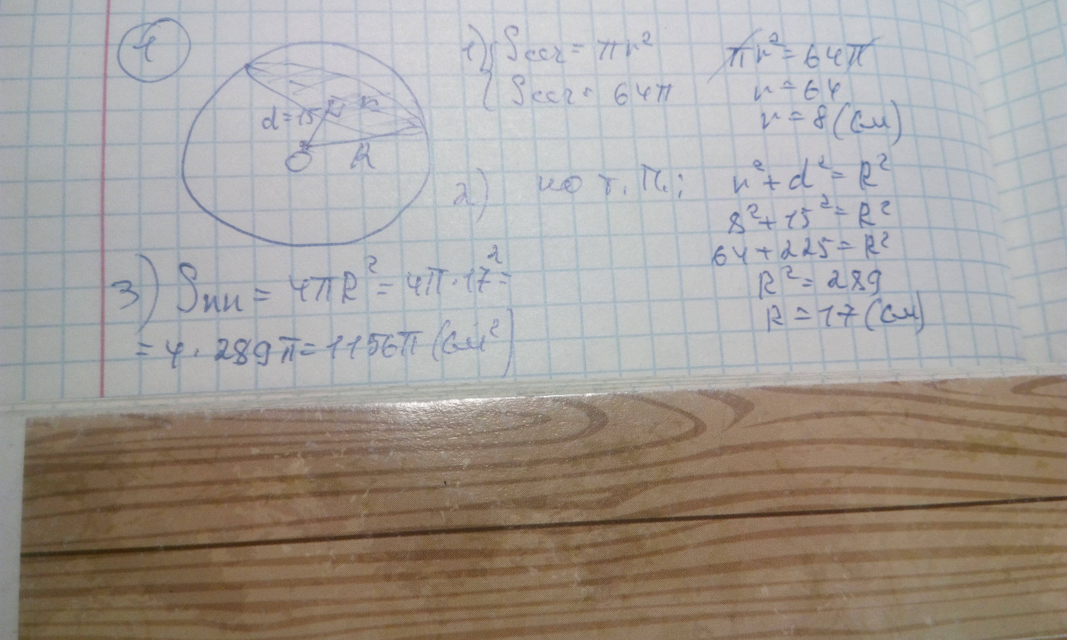 Площадь перереза сферы , которая отдаленная на 15см от ее центра , равна 64п см в квадрате. Найти площадь поверхности сферы