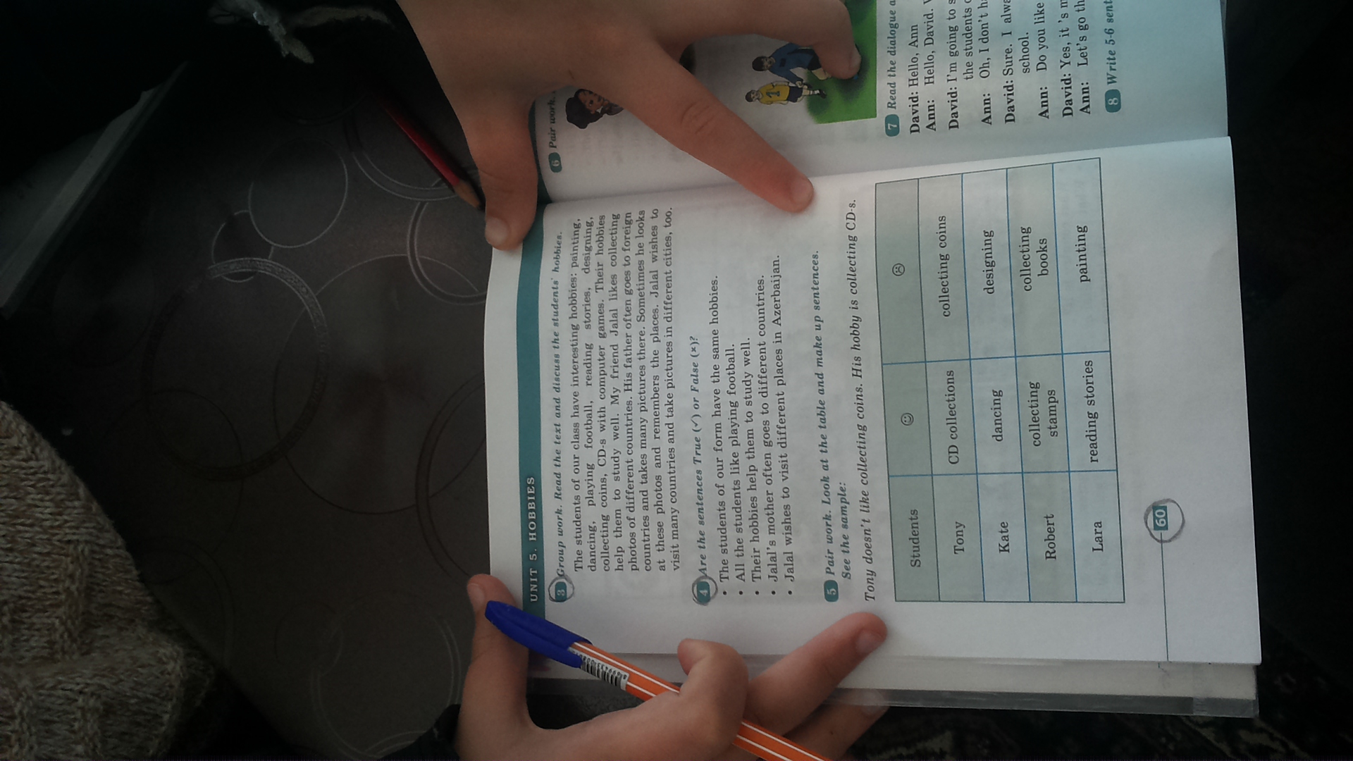 Студенты нашего класса имеют различные хобби: рисование, танцы, игра в футбол, чтение историй, дизайн, коллекционирование монет или дисков с компьютерными играми. Эти хобби помогают им учиться лучше. Мой друг Джалал любит коллекционировать фотографии различных стран. Его отец часто ездит в разные страны и привозит оттуда много фотографий. Иногда он смотрит те фото и вспоминает места в которых побывал. Джалал хочет посетить много стран и сделать фотографии в различных городах, тоже.