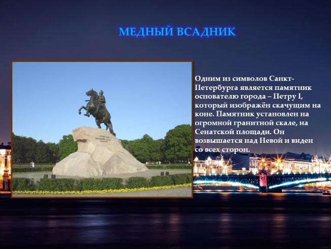 Одним из из символом Санкт Петербурга является памятник основателю города Петру первому который изображён скачущим на коне