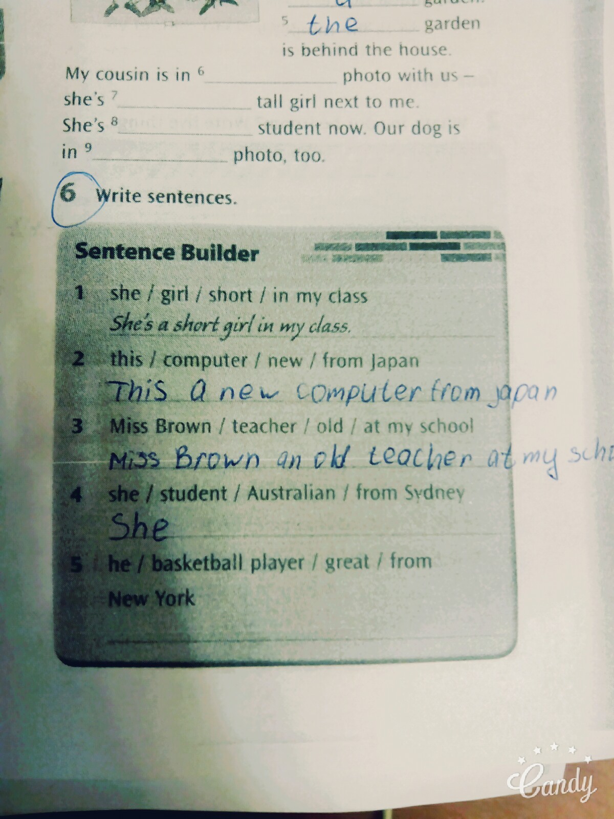 2)This a new computer from Japan 3)Miss Brown an old teacher at my school 4)She Australian a student from sydney 5)He great basketball player from New York