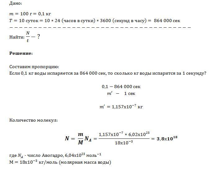 100г води,що була в склянці повністю випарувалась за 10 діб.Скількі в середньому молекул води вилітало із склянки за 1 с?