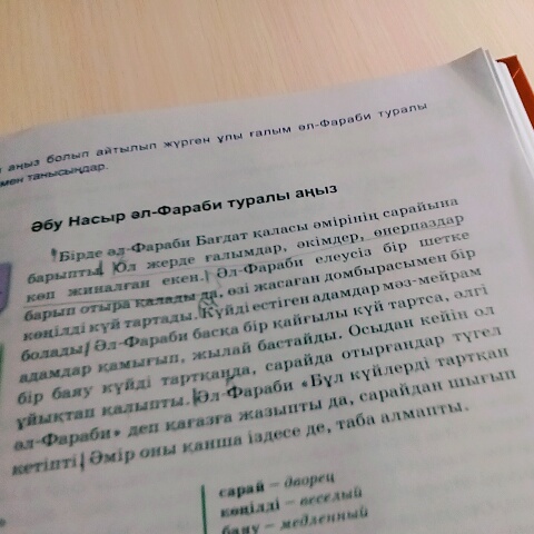 Однажды Аль-Фараби посетил дворец господина города Багдад.Там собралось много ученных,талантливых людей.Аль-Фараби сел в угол и исполнил веселый куй.Услышавшие куй люди,были в восторге.Когда Аль-Фараби исполнил грустный куй,те были тоже грустными и плакали.А когда он начал исполнять медленный куй,все уснули.Аль-Фараби написал на бумаге "Эти куи исполнил Аль-Фараби" и ушёл.Господин долго искал его,но не нашёл.