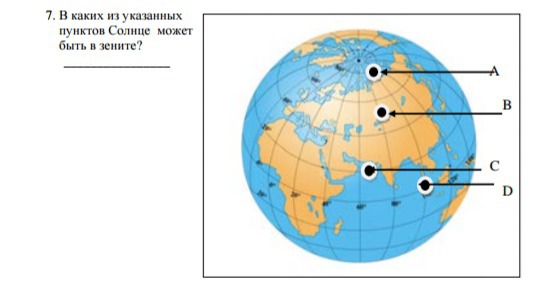 Зенит более возможен на точке С, так как солнечные лучи здесь будут примерно под углом 90°. Солнце в зените бывает между тропиками (2 раза в год) и в тропиках (раз в год). В остальных точках типа А и В зенит невозможен.