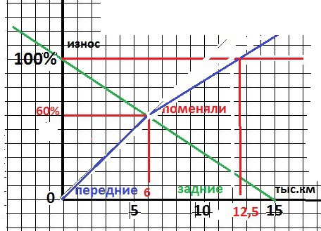 10000+15000 = 25000 км и делим поровну на передние и задние