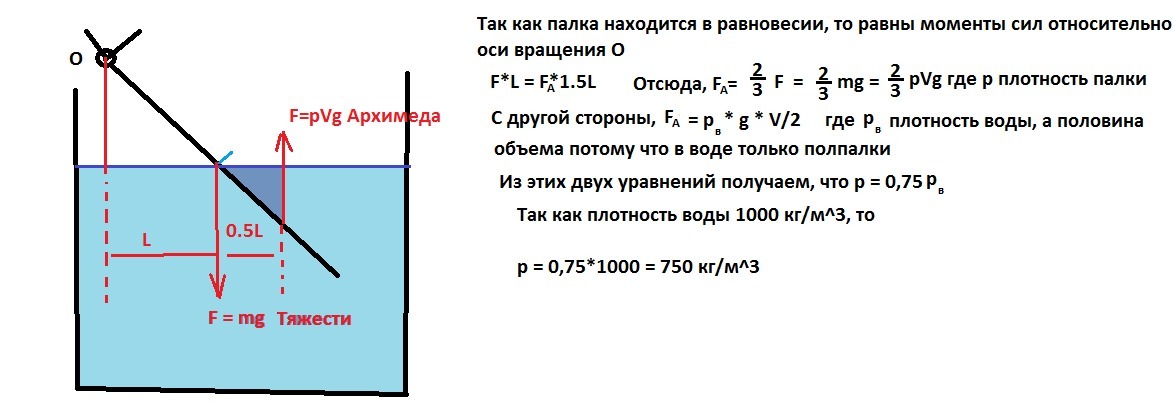 Палка шарнирно укреплена за верхний конец и наполовину погружена в воду . Какую плотность имеет материал, из которого изготовлена палка?