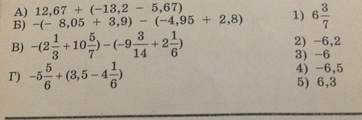 Поставьте в соответствие каждому выражению из первого столбца равное ему значении из второго столбца . А)12.67+(-13.2-5.67). 1) 6 3/7 Б)-(-8.05+3.9)-(-4.95+2.8). 2) -6.2 В)-(2 1/3+10 5/7)-(-9 3/14+2 1/6). 3)-6 Г)-5 5/6+(3.5-4 1/6) 4)-6.5 5)6.3