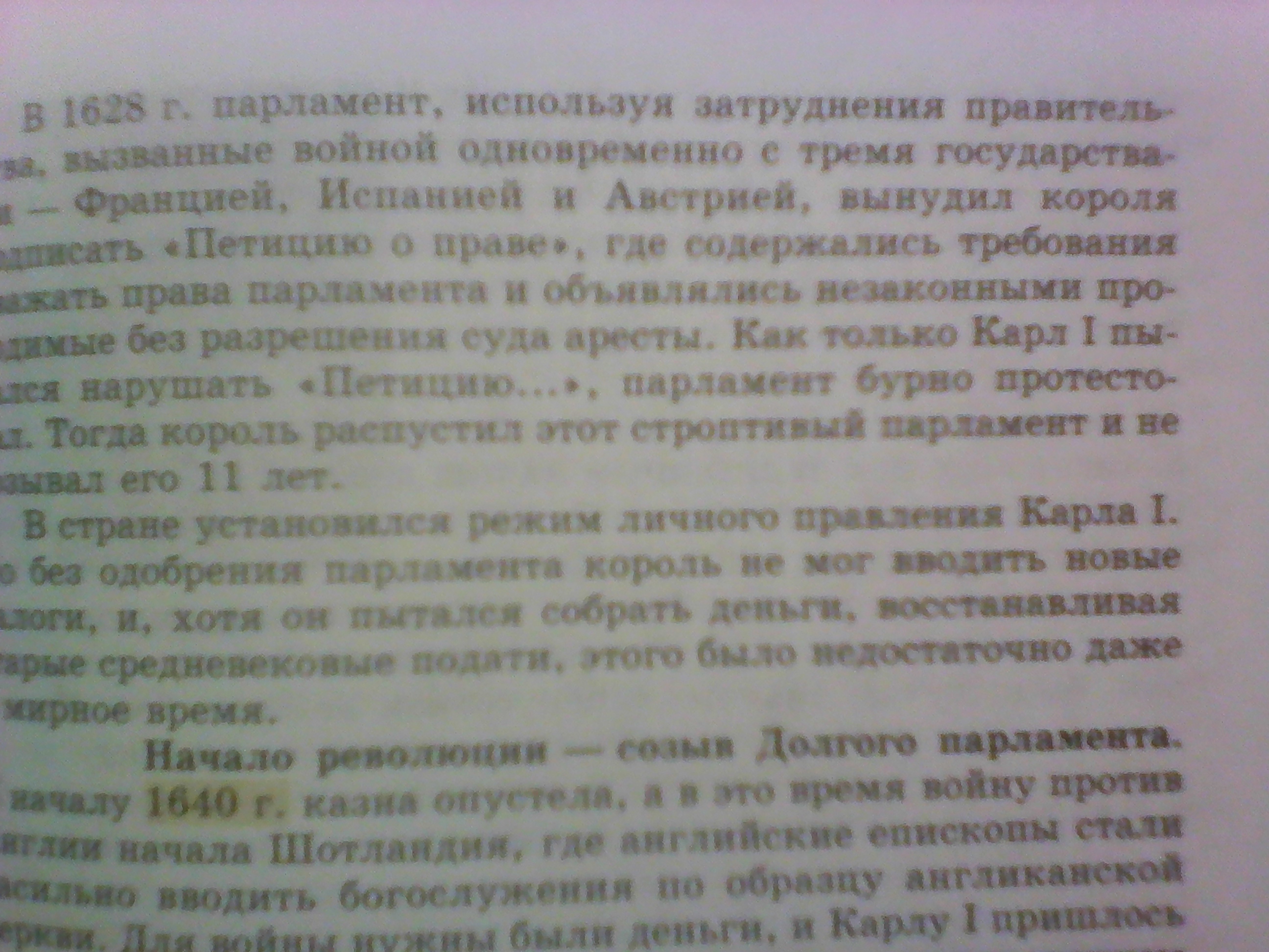 в 1628 г. парламент вынудил короля написать "Петицию о праве" , где содержались требования парламента .Когда Карл 1 попытался нарушить "Петицию..." , парламент протестовал.После король распустил парламент и не вызывал его 11 лет.