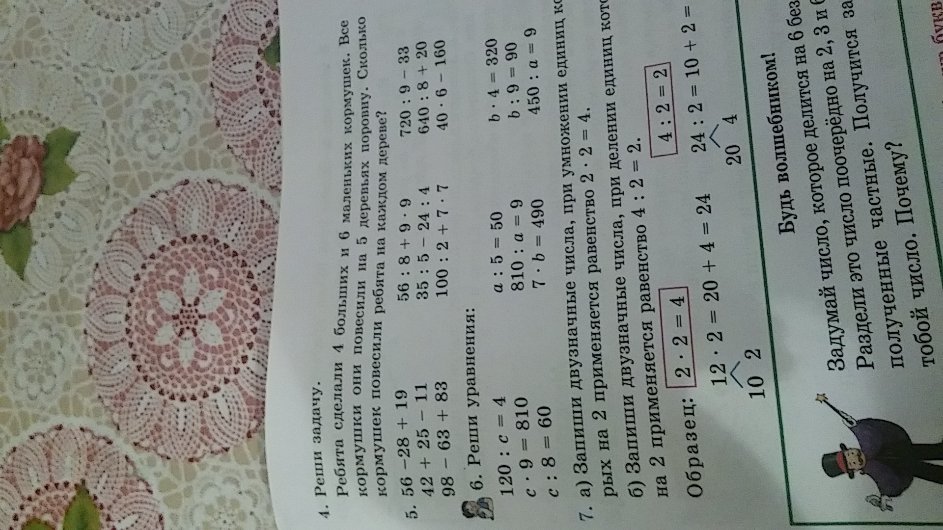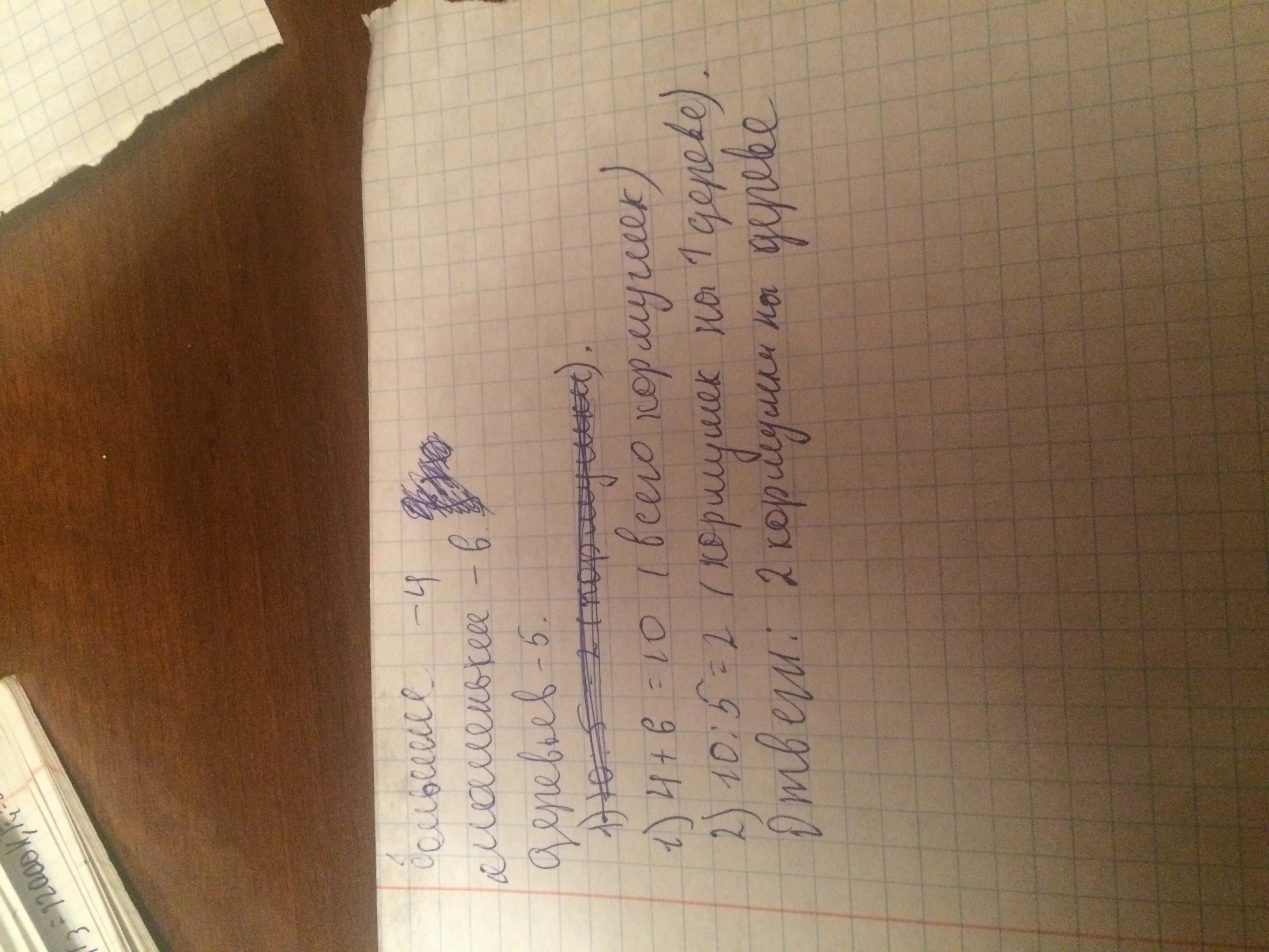 считаем общее число кормушек 4+6=10, потом на каждом дереве 10/5=2