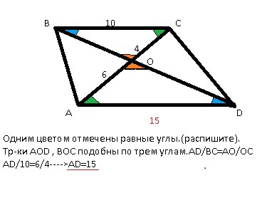 Точка пересечения диагоналей трапеции делит одну из диагоналей на два отрезка длиной 4 см и 6 см. Найдите длину большего основания трапеции, если длина меньшего основания равна 10 см.И объясните как сделали пожалуйста )