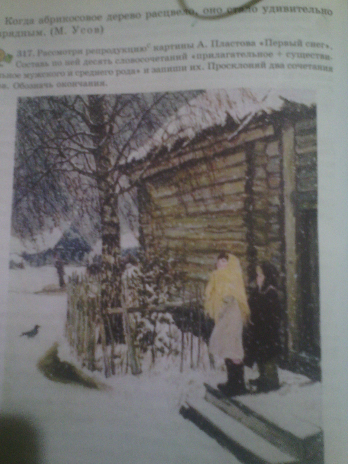 рассмотри репродукцию картины А.Пластова "Первый снег". составь по ней десять словосочетаний " прилагательное +существительное мужского и среднего рода" и запиши их. просклоняй два сочетания слов. обозначь окончания.
