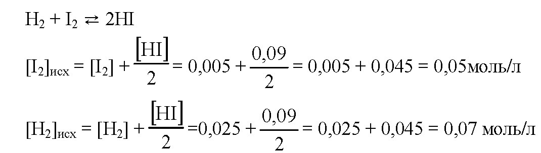 количество прореагировавшего H2 и I2 равняется половине количества образовавшегося HI. чтобы найти исходное значение, сложим концентрации прореагировавшего и оставшегося H2 и I2.