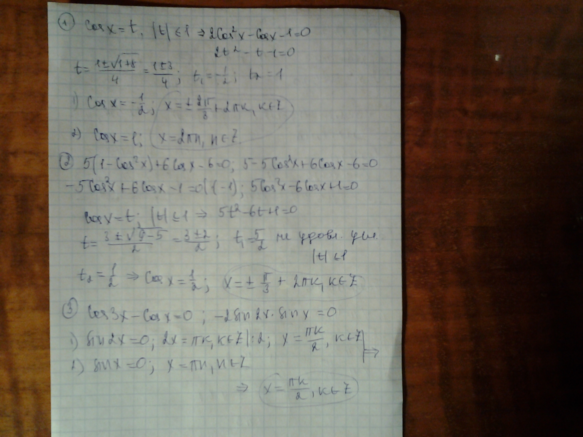 решите как уравнение 1) 2 cosx^2-cosx-1=0 2) 5 sin^2x+6cosx-6=0