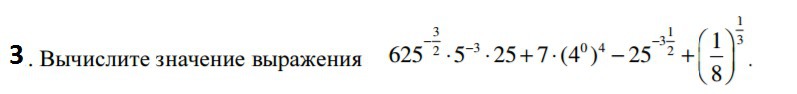 625^{- frac{3}{2} }*5^{-3}*25+7*(4^0)^4-25^{-3 frac{1}{2} }+( frac{1}{8} )^{ frac{1}{3} }= \  \