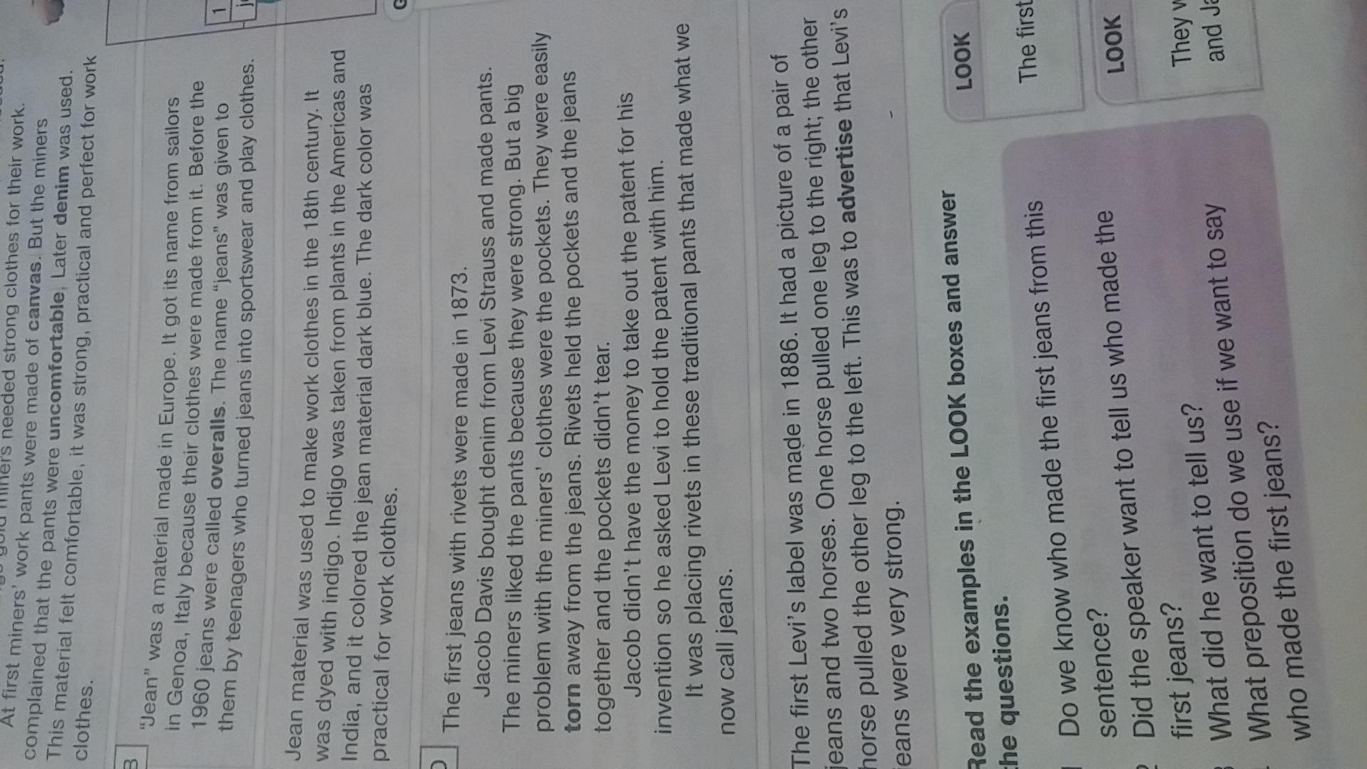 Перші джинси з заклепками були зроблені в 1873 році Якоб Девіс купив деніму від Levi Strauss і зробив штани. Шахтарі сподобалися штани, тому що вони були міцні . Але велика проблема з одягом шахтарів були кишені. Вони були легко відірвані від джинсів. Заклепки тримали кишені разом, і рівні нахилувшись кишені рвались .Яків не було грошей, щоб взяти патент на свій винахід він попросив Леві провести патент з ним. Це було розміщення заклепок в цих традиційних штанах ,які зробили те, що ми тепер називаємо джинси.