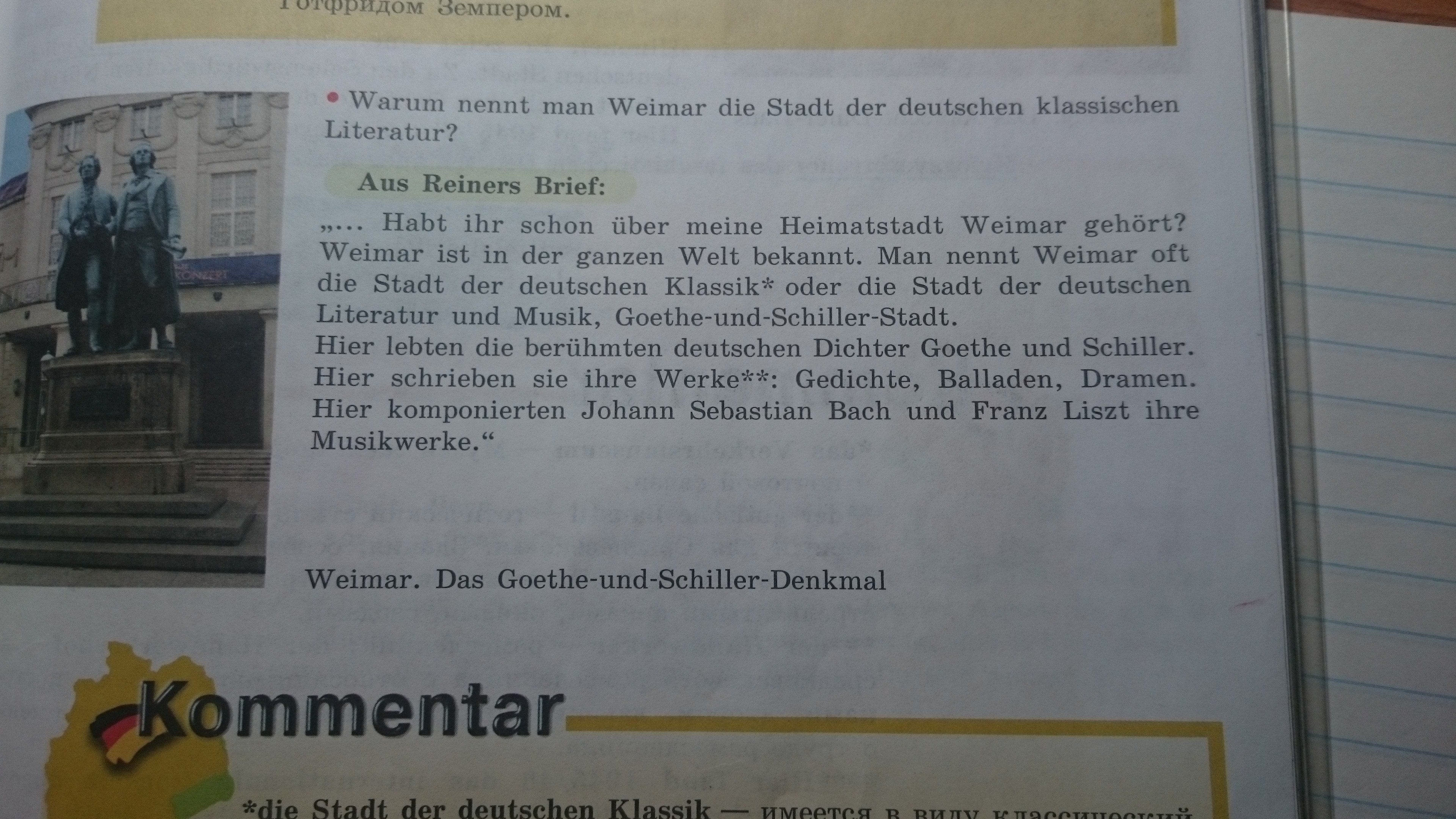вы уже слышали про мой родной город Ваймар? Ваймар известен на весь мир. некоторые зовут Ваймар городом немецкой классики или городом немецкой литературы и музыки, городом Гёте и Шиллера. Здесь жили известные немецкие писатели Гёте и Шиллер. они писали свои произведения:стихи, баллады, драмы.здесь сочиняли свои музыкальные произведения Иоганн Себастьян Бах и Ференц Лист.