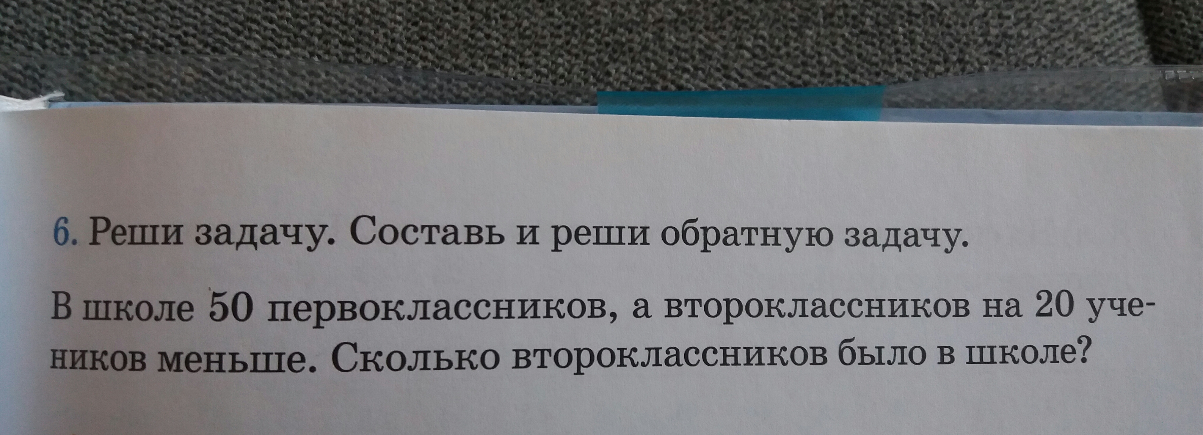 Реши задачу.Составь и реши обратную задачу. В школе 50 первоклассников, а второклассников на 20 учеников меньше Сколко волклассников вот в школе