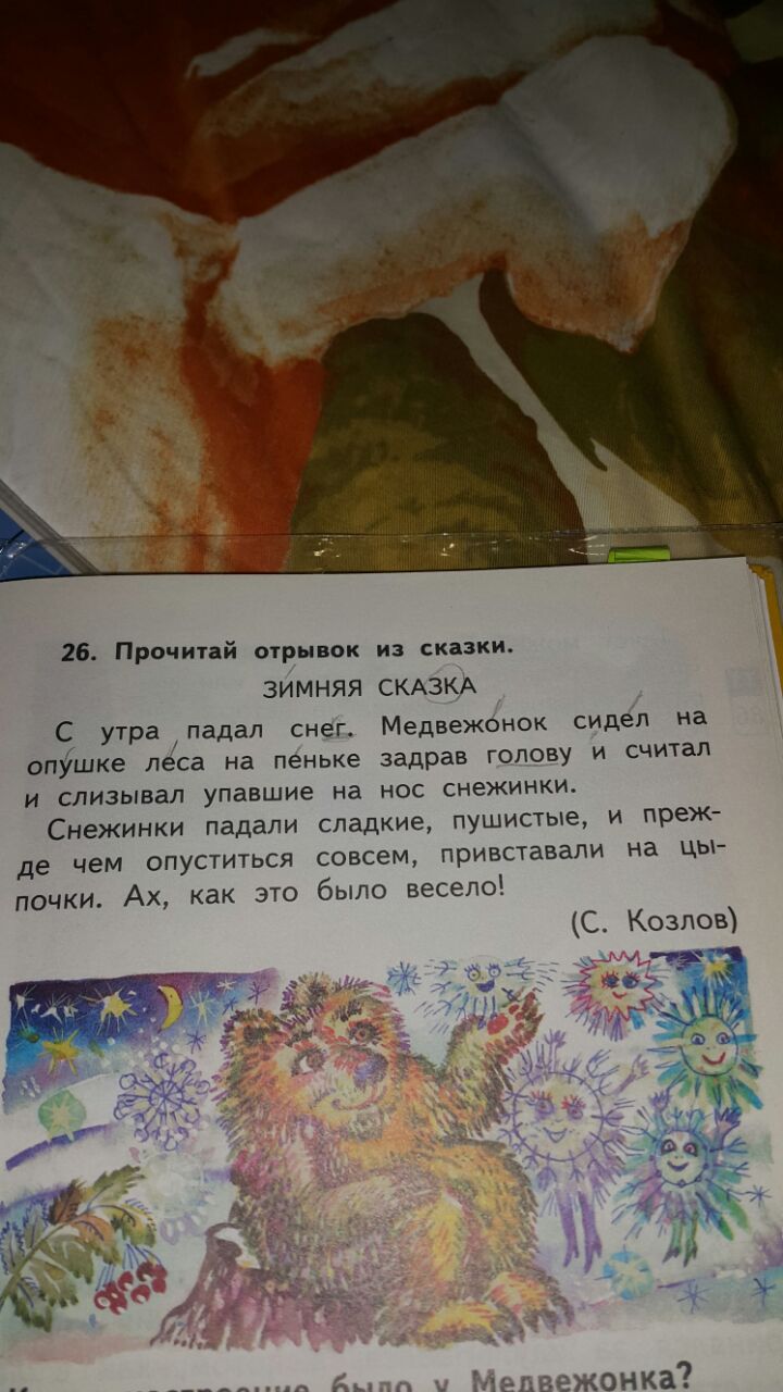 С утрА- бзударная- у,снеГ-е,пАдал-2я а,медвежОнок-е,е., сИдел-е,опУшке-о,лЕса-а,пЕньке-е.И так далее