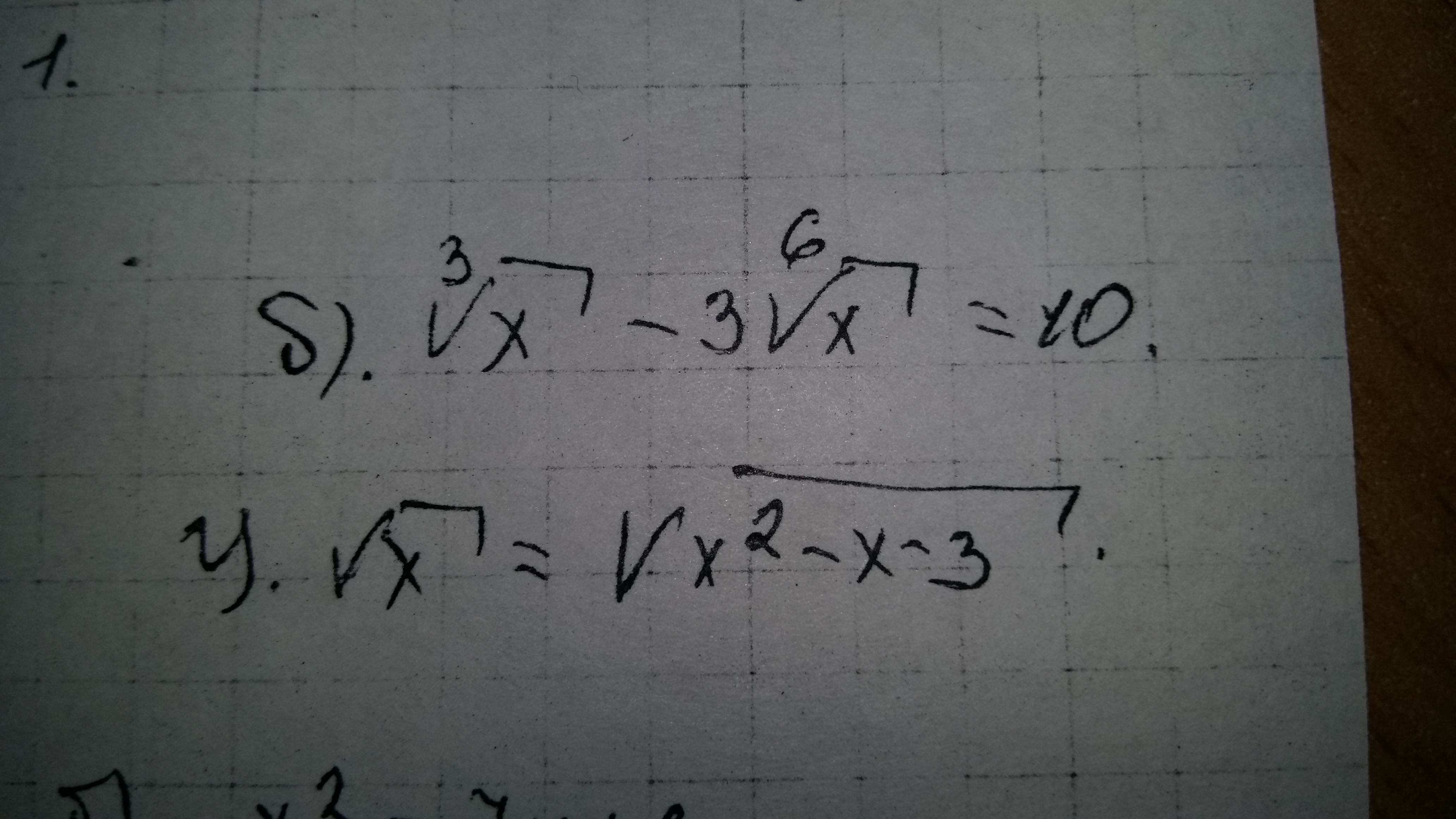 ³√x-3⁶√x=10 ⁶√x=t t²-3t-10=0 по Виету t1=5 t2=-2