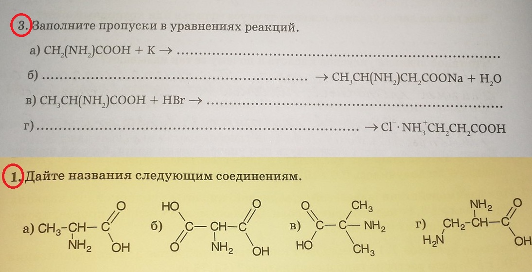 Помогите пожалуйста сделать 2 задания. Тема аминокислоты. Заранее спасибо, лучший ответ обязательно отмечу! :)