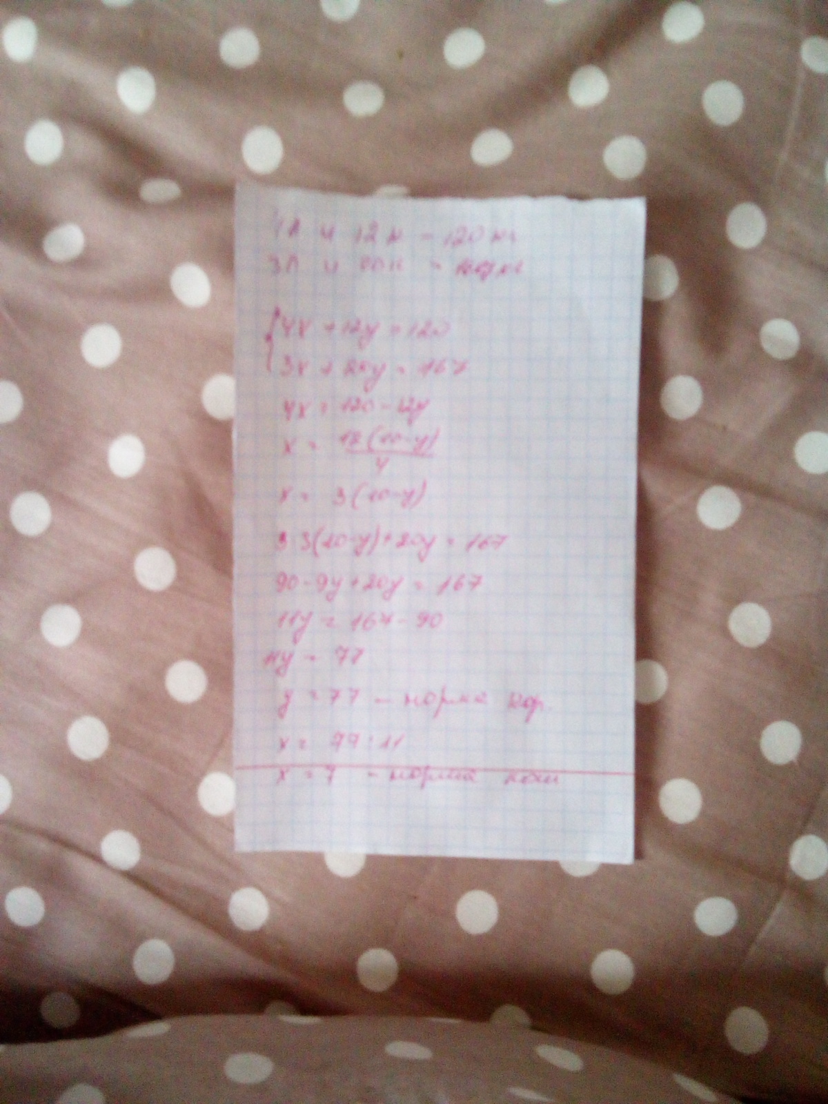 Чтобы накормить 4 лошадей и 12 коров, надо 120 кг сена в день, а чтобы накормить 3 лошадей и 20 коров - 167 кг сена.Найдите дневную норму сена для лошади и для коровы.