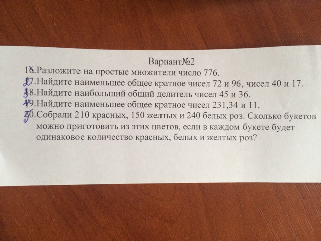 150=2*3*5*5 210=2*3*5*7 240=2*2*2*2*3*5 НОД(150,210,240)=2*3*5=30- количество букетов с одинаковым количеством цветов разного цвета Ответ:30 букетов