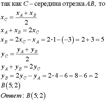 найдите координату точки B отрезка AB , если A (-3,6),а точка C (1,4)-середина отрезка AB помогите, срочно