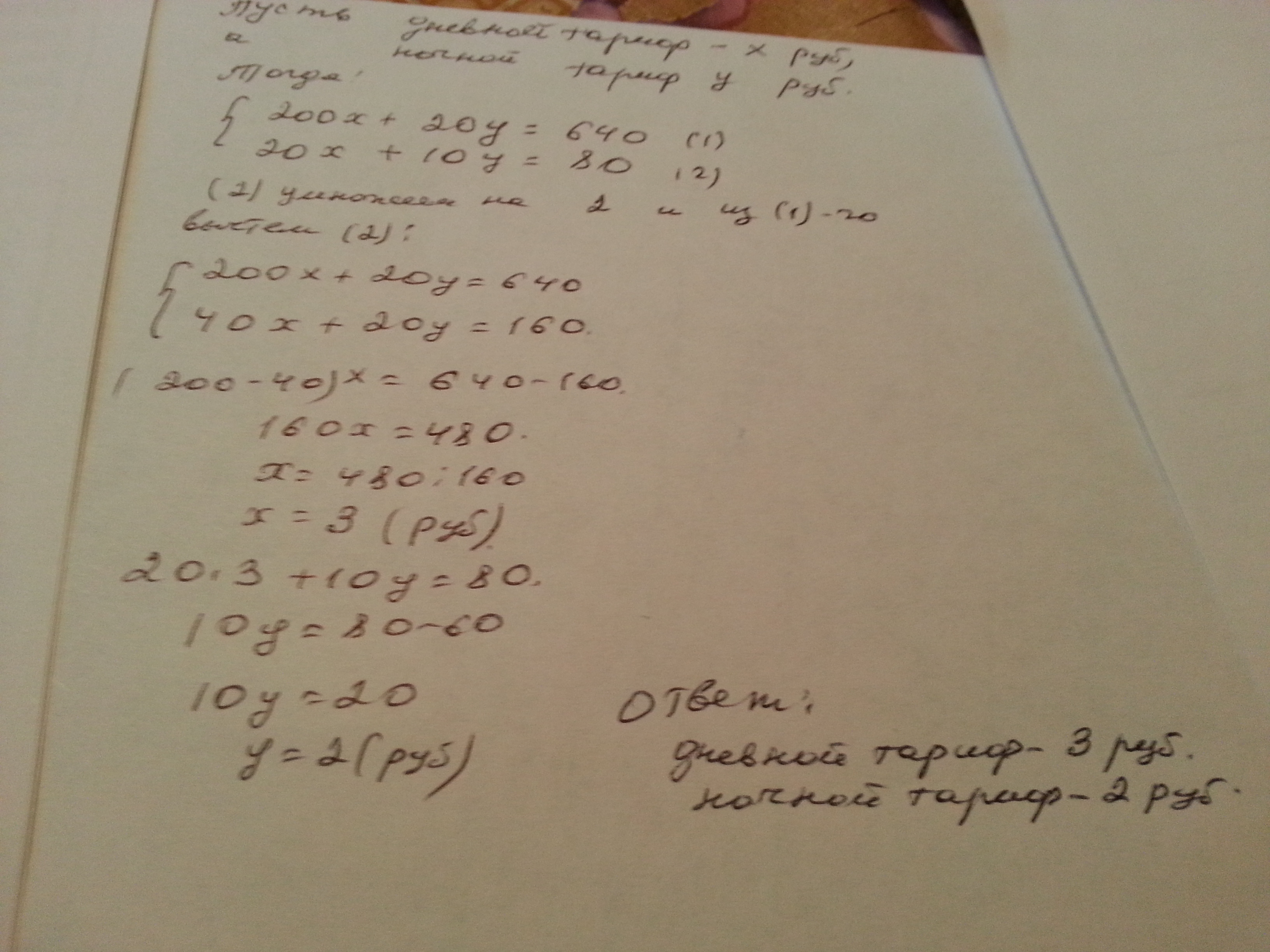В квартире Ивана Петровича установлен двухтарифный счётчик ,который позволяет учитывать расход электроэнергии по разным тарифам в дневное и ночное время .В январе расход электроэнергии в дневное время составил 200киловатт(кВт),а в ночное-20 кВт.По квитанции Иван Петрович заплатил 640 р. В июле расход электроэнергии в дневное время составил 20 кВт в час, а в ночное 10 кВт. По квитанции Иван Петрович заплатил 80 р. Вычислите дневной и ночной тариф расхода электроэнергии.