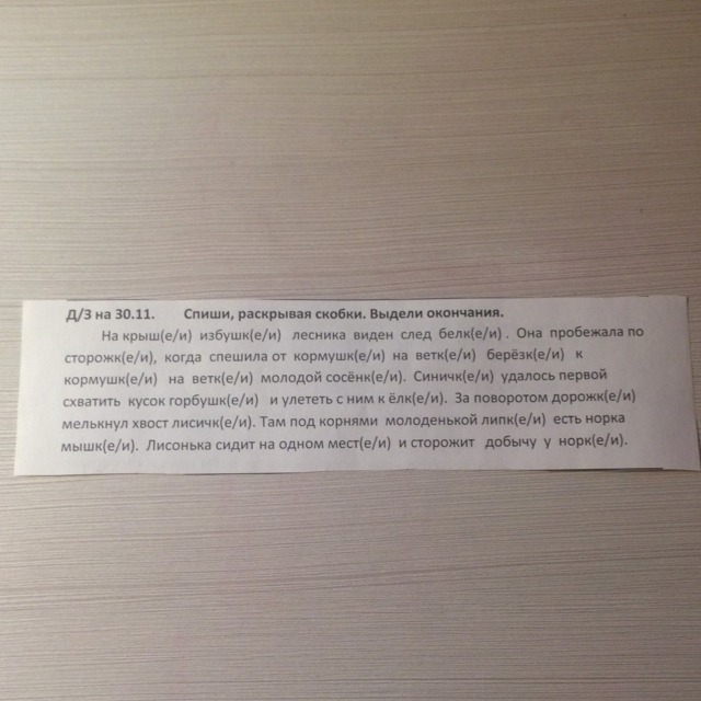 На крыше( окончание е )избушки (окончание и) лесника виден был след белки (окончание и) Она пробежала по сторожке (окончание е) когда спешила от кормушки окончание и) на ветки (окончание и) березки (окончание и)