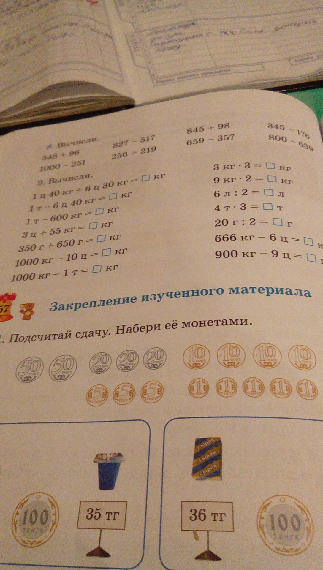 1 ц это 100 кг 1 т это 1000 кг. 140+630=770(кг) 1000-640=360(кг). 1000-600=400(кг). 300+55=355(кг). 350+650=1000(г)=1 (кг). 1000-100=900(кг). 1000-1000=0(кг). 3*3=9(кг). 9*2=18(кг). 6:2=3(л). 4*3=12(т). 20:2=10(г). 666-600=66(кг). 900-900=0(кг).