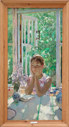 Портретам дочери в творчестве Мыльникова отведено особое место. Он постоянно возвращается к этому образу, любуясь чистотой, непосредственностью, девичьей грациозностью. И, пожалуй, немногим из современных художников удалось так проникновенно передать сложность и непосредственность мира ребенка. В произведениях " Верочка больна" (1955), " Верочка " (1955), "Портрет дочери" (1957), "Больная Верочка " (1958), "Портрет Верочки " (1965), " Верочка у окна" (1965), " Верочка " (1971) образ развит во времени. В этих портретах, по-доброму созерцательных, всегда чувствуется настроение художника, восхищенно следящего за моделью. Он не фиксирует, а создает увиденный, пережитый, прочувствованный детский образ, который захватывает и надолго остается в памяти как дорогой и близкий каждому. Жизнеутверждающим, радостным мироощущением проникнут портрет " Верочка на даче" (1957), по праву причисляемый к лучшим работам Мыльникова. Художник пишет гибкую фигурку девочки с тонкой шейкой, темными шелковистыми волосами, опускающимися косичкой на спину. Верочка сидит за столом у окна. Легкая детская фигурка повернута в профиль, руки как бы на миг положены на стол. Бесхитростная простота и ясность образа находят отклик во всем колористическом строе полотна. В более позднем портрете " Верочка " (1964) цвет является основным средством раскрытия образа, характера модели. Светлая колористическая гамма, построенная на гармонии, цветовых нюансах и градациях, создает настроение внутреннего равновесия, ясности и душевной чистоты. Верочка изображена за столом на веранде. Перед ней открытая книга. Кажется, что девочка на минуту оторвалась от чтения и, подперев ладонями подбородок, думает о прочитанном. В распахнутое окно врываются потоки теплого воздуха, лучи яркого солнечного света скользят по волосам, фигуре ребенка, освещают дощатый стол, переливаются нежными красками в букете на столе. "Цвета, как звуки, сталкиваются и создают настроение...- говорит художник.-В цвете может быть решен смысл картины".