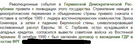 Революционные события в Германской Демократической Республике привели к ликвидации этого государства. Стремление немцев к демократическим переменам и объединению страны привело сначала к отставке в октябре 1989 г. лидера восточногерманских коммунистов Эриха Хонеккера, а затем к падению Берлинской стены, символизировавшей послевоенный раскол Европы. М. С. Горбачёв, остро нуждавшийся в западных кредитах, согласился вывести советские войска из Восточной Германии. В октябре 1990 г. был заключён договор о вхождении ГДР в состав ФРГ. Материал с сайта http://worldofschool.ru