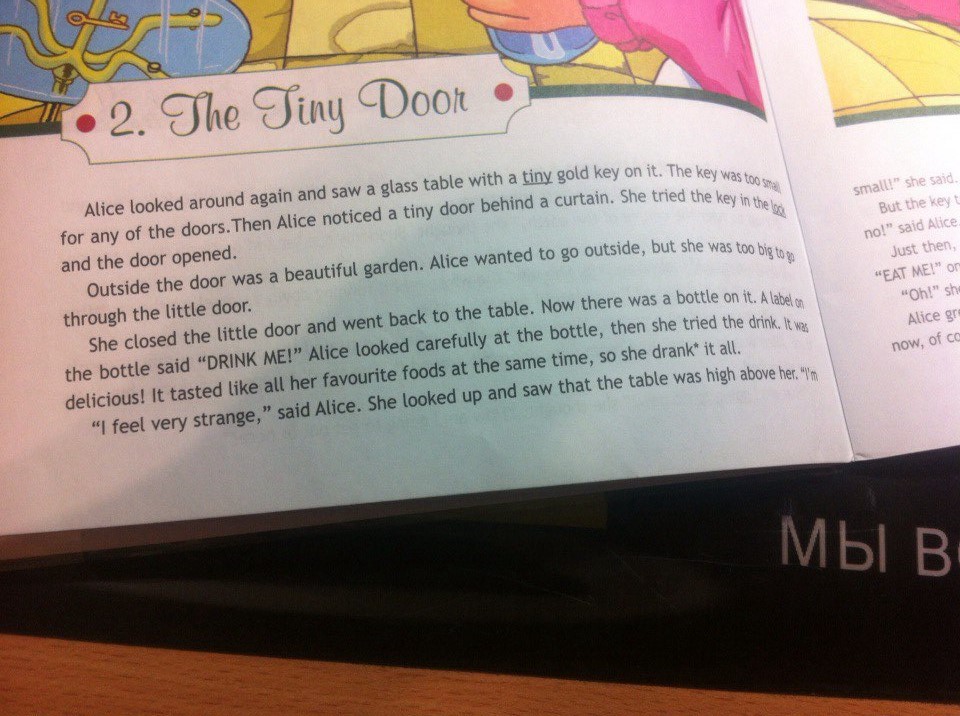 оно закрыла маленькую дверь и вернулась к столу.там была бутылка.надпись на бутылке говорила выпей меня.алиса с осторожностью смотрела на неё и потом попыталась её выпить. это было вкусно.этот вкус понравился ей больше всех вкусов напиток которые она пила.