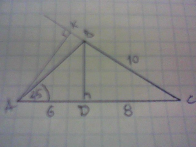 В треугольнике абс угол а равен 45 градусов, сторона BC равна 10 см а высота BD делит сторону ас на отрезки AD=6см DC=8см. Найдите площадь треугольника и высоту проведенную к стороне BC