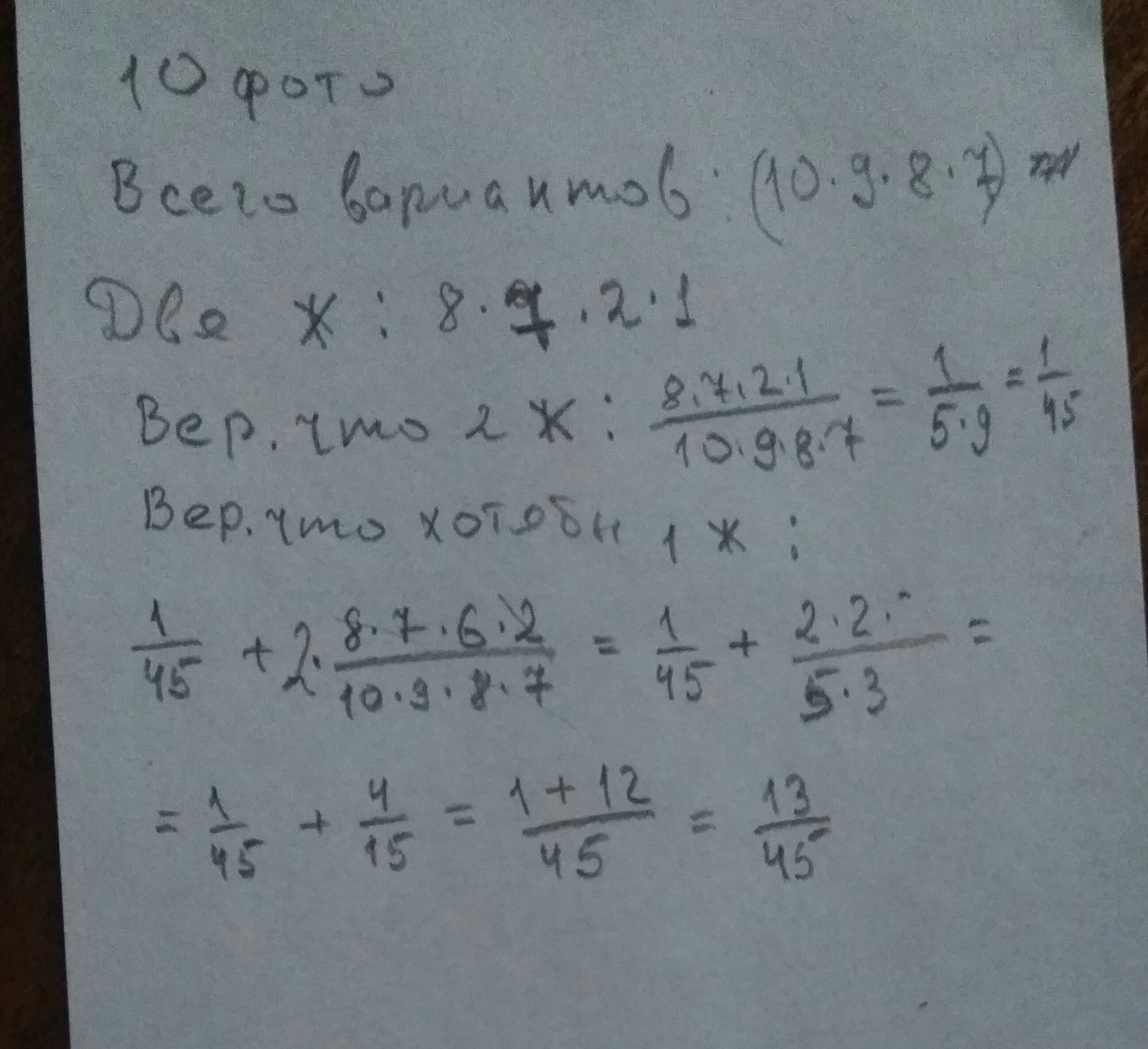 1. В конверте 8 мужских и 2 женские фотографии. Из конверта берут 4 фотографии. Какова вероятность того, что из них: а) ровно две женские фотографии; б) есть хотя бы одна женская фотография?