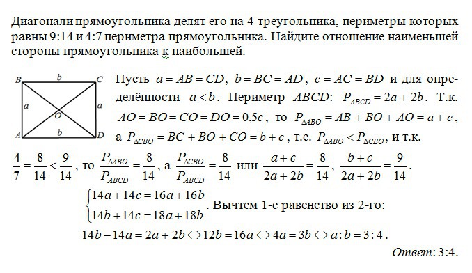 Диагонали прямоугольника делят его на 4 треугольника, периметры которых равны 9:14 и 4:7 периметра прямоугольника. Найдите отношение наименьшей стороны прямоугольника к наибольшей.