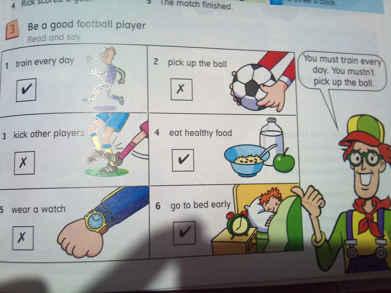You must train every day. You mustn't pick up the ball. You mustn't kick other players. You must eat healthy food every day. You mustn't wear a watch. You must go to bed early every day.