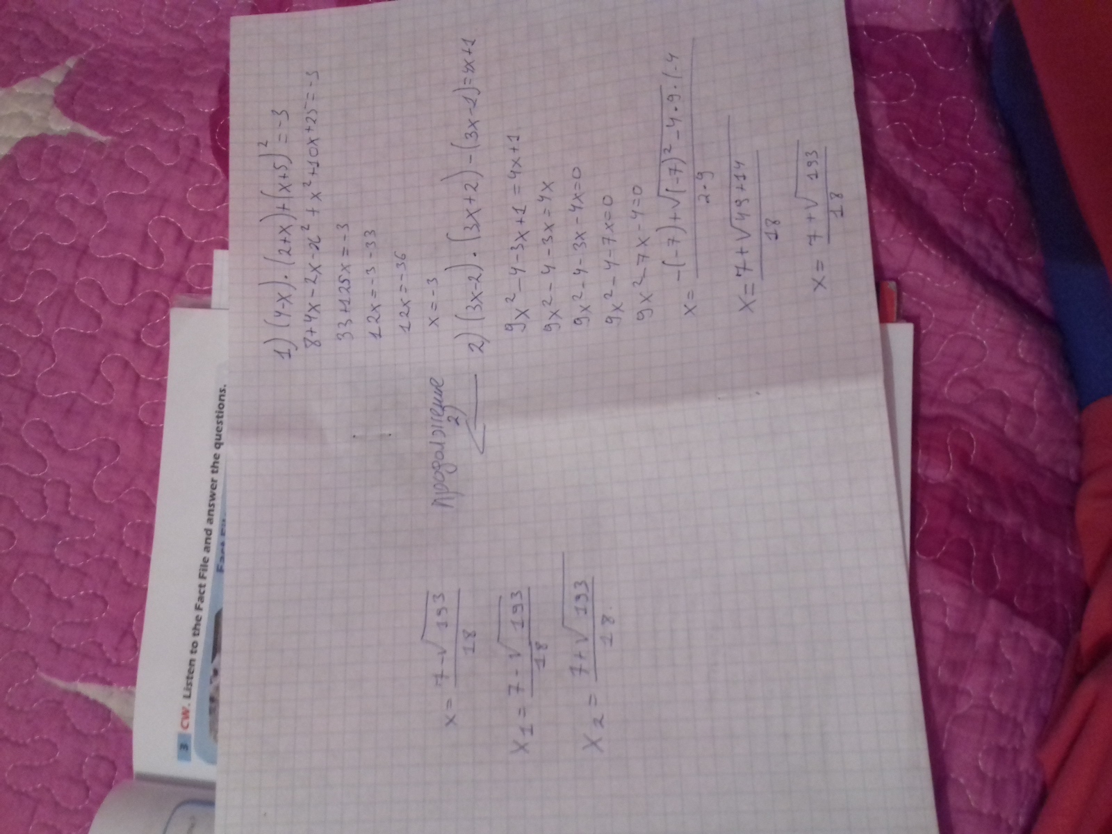 реши уравнение 1) (4-х)(2+х)+(х+5)²=-3 2) (3х-2)(3х+2)-(3х-1)=4х+1 упрости выражение 1) а(+4)+(2а-3) 2) (х-3)-(х+1) 3) (у²-у)+(3у-у²)