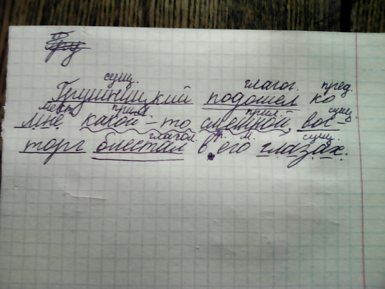 Грушницкий подошёл ко мне какой-то смешной, восторг блестал в его глазах.(Сложное пр., повествовательное, невоскл., распр.)
