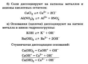 тированные ионы . Уравнение электролитической диссоциации хлороводорода выглядит так: . В составе кислот, солей и оснований (щелочей) можно выделить части, определяющие их химические свойства. У кислот это ионы водорода, у солей — ионы металлов и кислотных остатков, у щелочей — ионы гидроксогрупп.