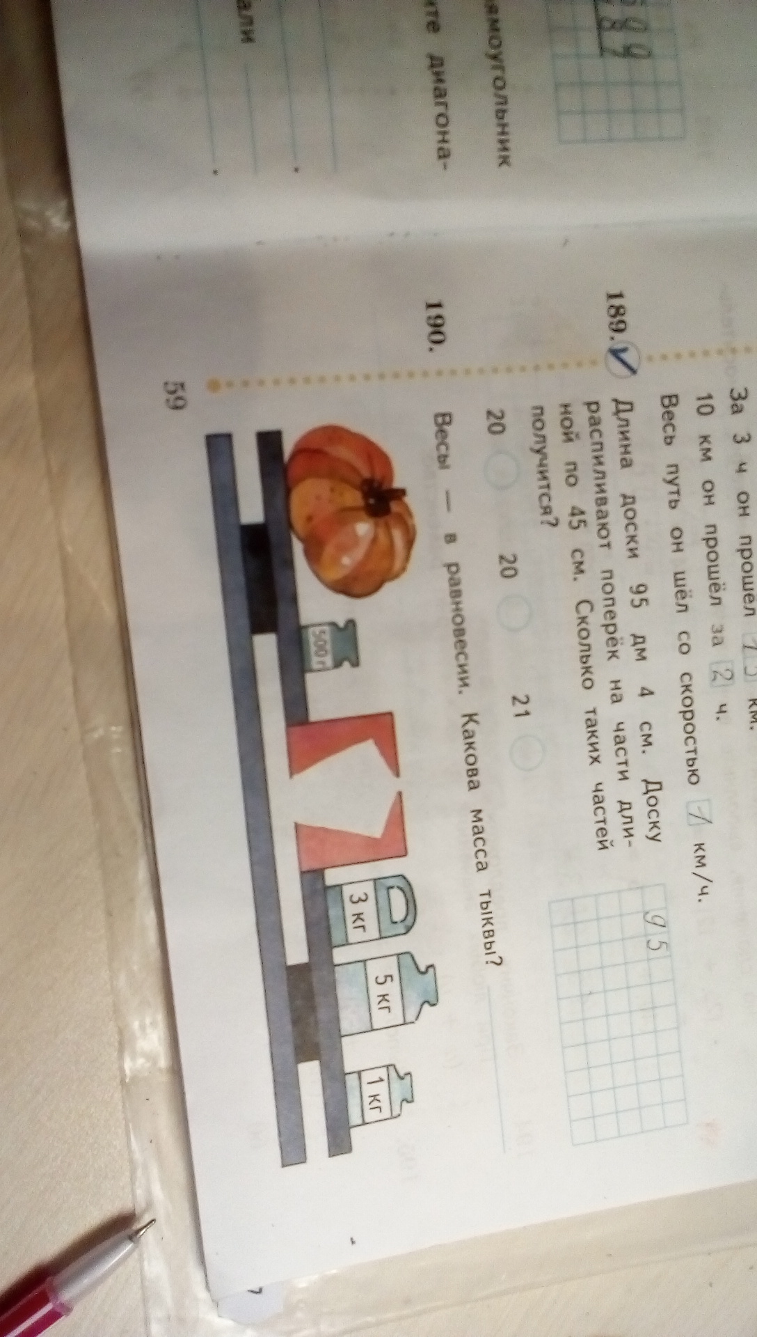 длина доски 95 дециметров 4 сантиметров доску распилили поперек на части длиной по 45 сантиметров сколько таких частей получится (НОМЕР 189)