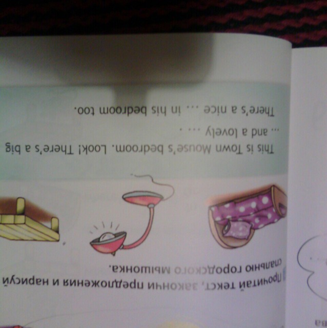 Это спальня городского мышонка. Посмотри! Здесь есть большой стол милая лампа. Здесь также есть прекрасная кровать.