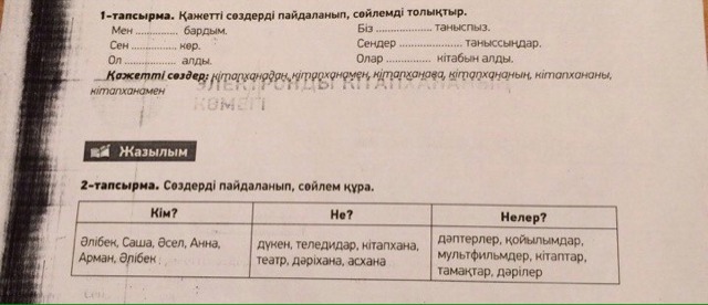 Алибек дукеннен даптерлер сатып алды.Саша китапханадан китаптар алды. Асел теледидардан мультфильмдер корип отыр . Анна дариханадан дарилер алды .Арман асханадан тамактар алды .Алибек театрда койылымдарды карады.