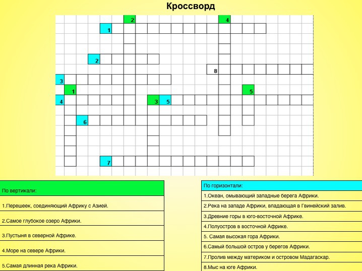 По Горизонтали: 1) Атлантический. 2) Нигер. 3) Драконовы. 4) Сомали. 5) Килиманджаро. 6) Мадагаскар. 7) Мозамбикский. 8) Игольный.