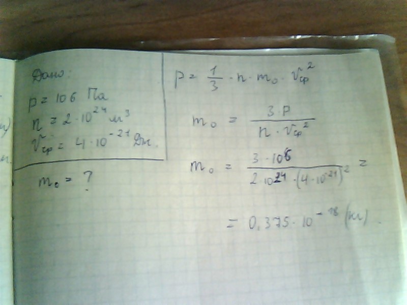 Найти массу молекулы, если он имеет давление 106 Па, концентрацию 2*1024 м-3, а его средняя кинетическая энергия молекул равна 4*10-21 Дж.