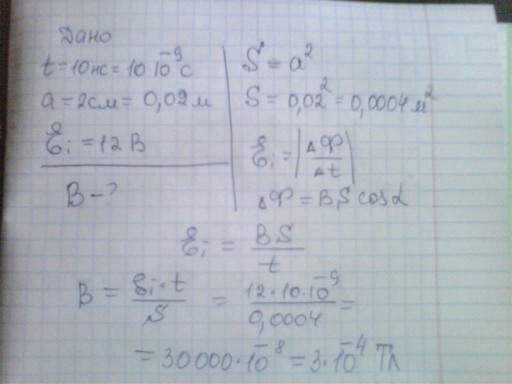 При включении магнитного поля за время 10 нс, в квадратной рамке со стороной 2 см расположенной перпендикулярно к нему возникает ЭДС равное 12В. Модуль магнитной индукции включенного поля равен