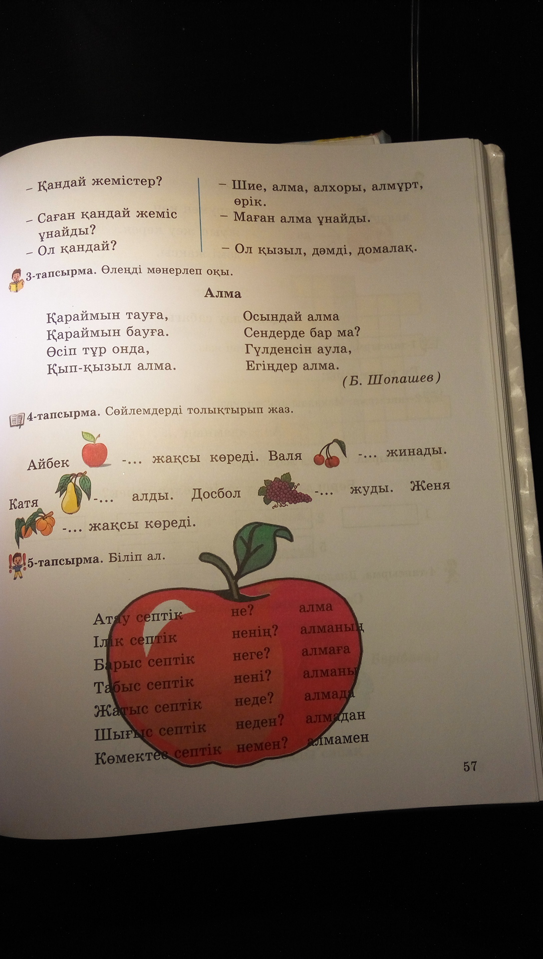 Айбек алма жақсы көреді. Валя шие жинады. Катя алмұрт алды. Досбол жүзім жуды. Женя өрік жақсы көреді.