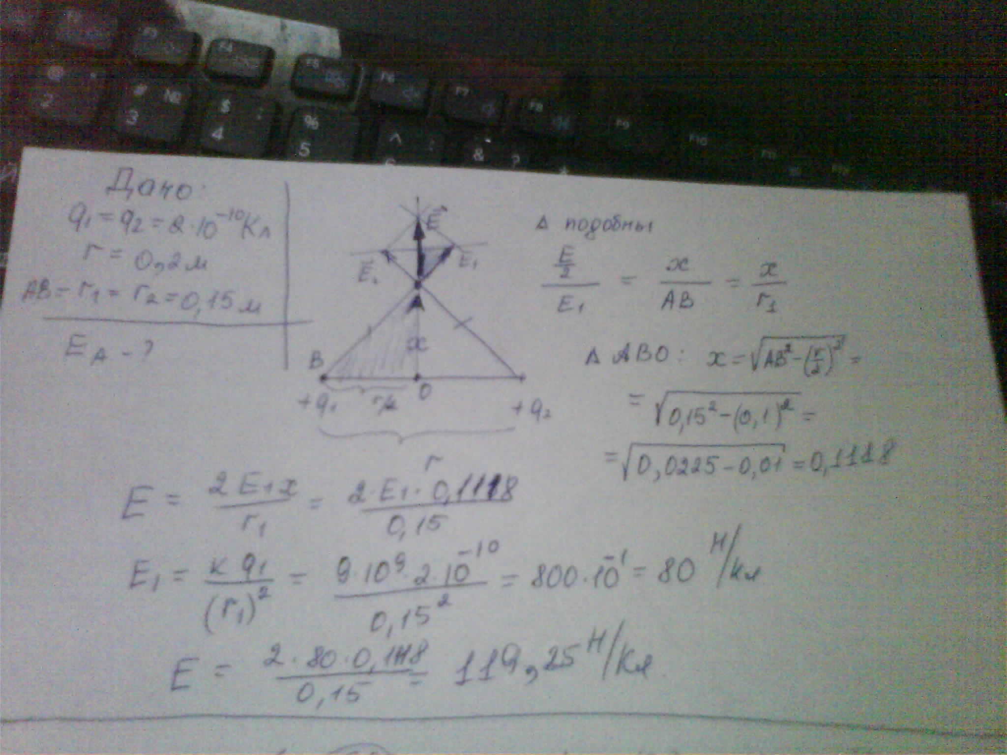 два заряда по 2*10^-10Кл находятся в воздухе на расстоянии 20 см друг от друга. Найдите напряженность поля на расстоянии 15 см от обоих зарядов (желательно с рисунком)